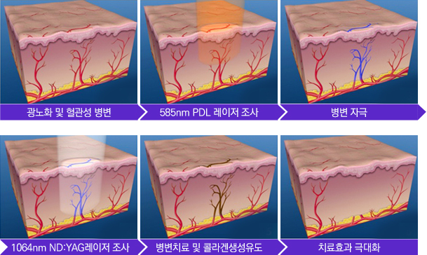 3. 585nm Pulsed Dye레이저와 피부재생에 효과적인 1064nm Long Pulsed Nd:YAG레이저 두 개의 레이저가 하나의 시스템으로 구성되어 치료효과를 극대화시키는 멀티플렉스 시술